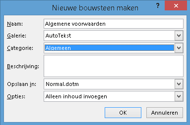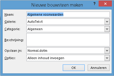 - Kies de gewenste autotekst, in ons voorbeeld is dat Algemene voorwaarden