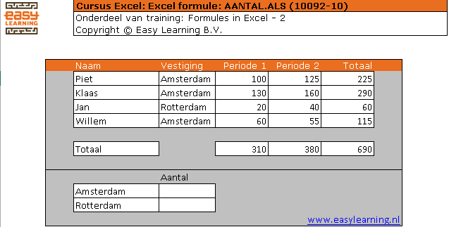 Je geeft in deze functie op waar moet worden gezocht en naar welke waarde. In ons voorbeeld willen we weten hoe vaak de waarde “Amsterdam” in de lijst voorkomt en hoeveel keer “Rotterdam”.