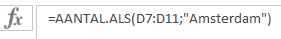 Formule in cel D15: =AANTAL.ALS(D7:D11;”Amsterdam”)