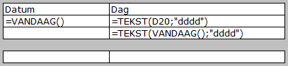 Om ervoor te zorgen dat na het invoeren van een datum ook de dag wordt getoond moet een functie worden gebruikt. Gebruik in je Excel formule de functie TEKST.