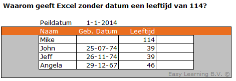 Om te kunnen rekenen met datum in Excel, geeft Excel aan elke datum een getal. 1-1-1900 is de eerste dag waarmee Excel rekent. Niet vreemd dus dat dat dag 1 is. Wanneer je dus een vergelijking maakt tussen een lege datum en een peildatum, wordt de leeftijd (DATUMVERSCHIL) uitgerekend van 01-01-1900 en in dit geval 01-01-2014