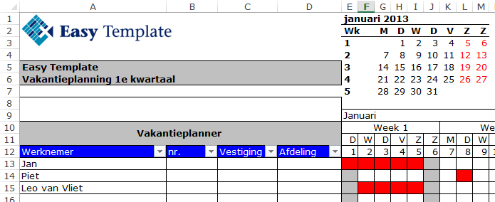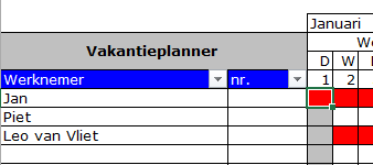 In ons voorbeeld gebruiken wij een vakantieplanner. Hier zijn de rijen voorzien van gegevens per medewerker en de kolommen worden gebruikt voor de dagen. In dit geval willen we dat zowel de eerste kolommen en de bovenste rijen blijven staan als er naar rechts of naar beneden wordt verplaatst. Door de titels in Excel vast te zetten, schuift te tekst al het ware onder de titels door.