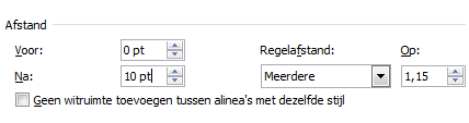 - Pas dit naar uw wens aan. Voor een normale tekst wordt meestal afstand voor en afstand na op 0 pt gezet.