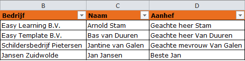 - Zorg dat er ook een kolom is voor de aanhef. Dit voorkomt het samenstellen van de aanhef en het houden van extra spaties
