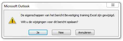 - Omdat er wijzigingen in een bericht zijn aangebracht, vraagt Outlook of deze moeten worden opgeslagen bij het sluiten van het bericht