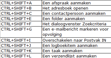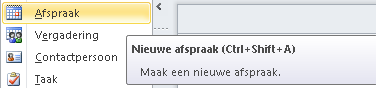 Overal in Outlook kan bijvoorbeeld met CTRL+SHIFT+A een nieuwe agenda afspraak worden gemaakt. Maar het is niet zinvol om deze toetscombinaties uit het hoofd te leren.