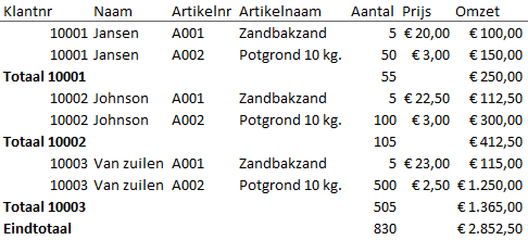 - Het overzicht wordt nu getoond met subtotalen per klant voor de kolommen Aantal en Omzet