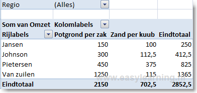 Bij het rapportfilter stel je in tot welke gegevens het overzicht beperkt moet worden. Wanneer je alleen de gegevens wilt zien van een bepaalde regio zet je het veld regio in het rapport filter