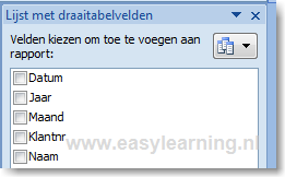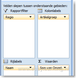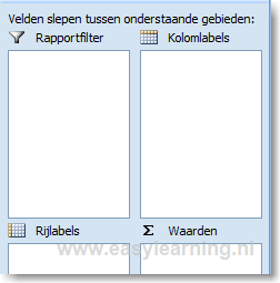 Hierin staan alle koppen uit het gegevensgebied. Door deze velden te slepen naar de gebieden van de draaitabel worden de gegevens zichtbaar